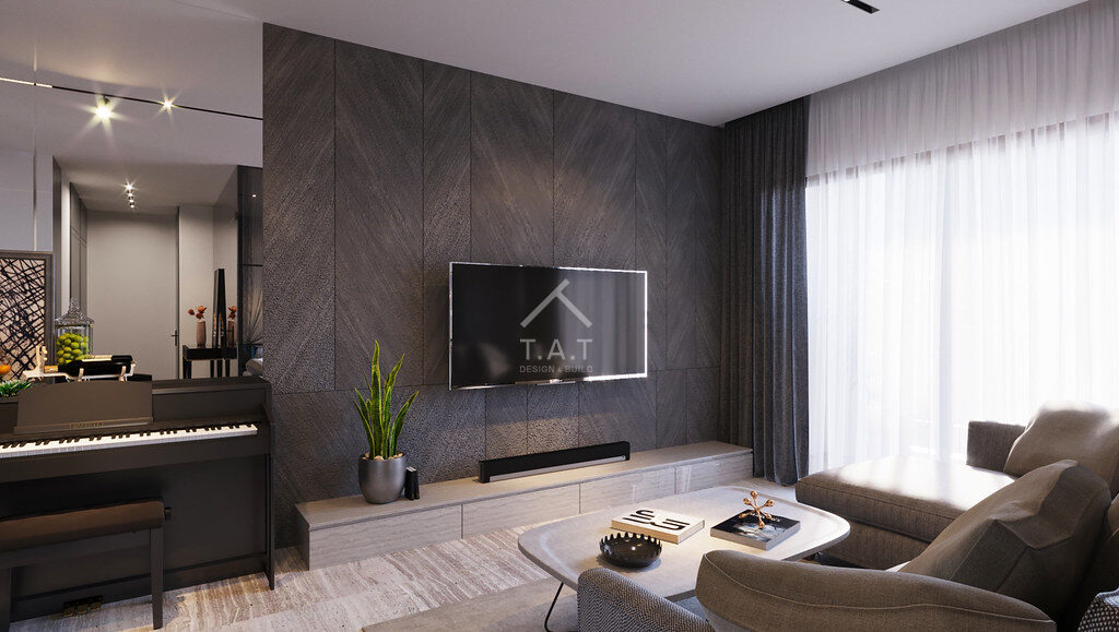 - Ốp vách Laminate/Gỗ công nghiệp: Các mảng khối màu xám đen được chia ron (groove) tỉ mỉ, tạo chiều sâu cho diện tường.