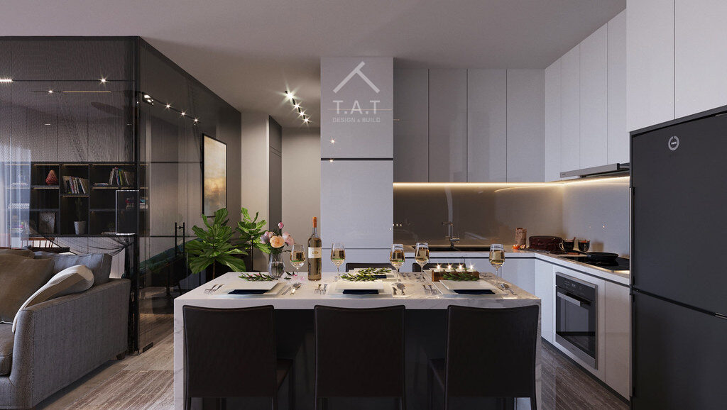 - Đảo bếp và mặt bếp được ốp đá trắng vân mây sang trọng. Việc sử dụng khối đá trắng giữa nền sàn tối màu tạo ra một “điểm tụ” ánh sáng cho khu vực sinh hoạt chung.