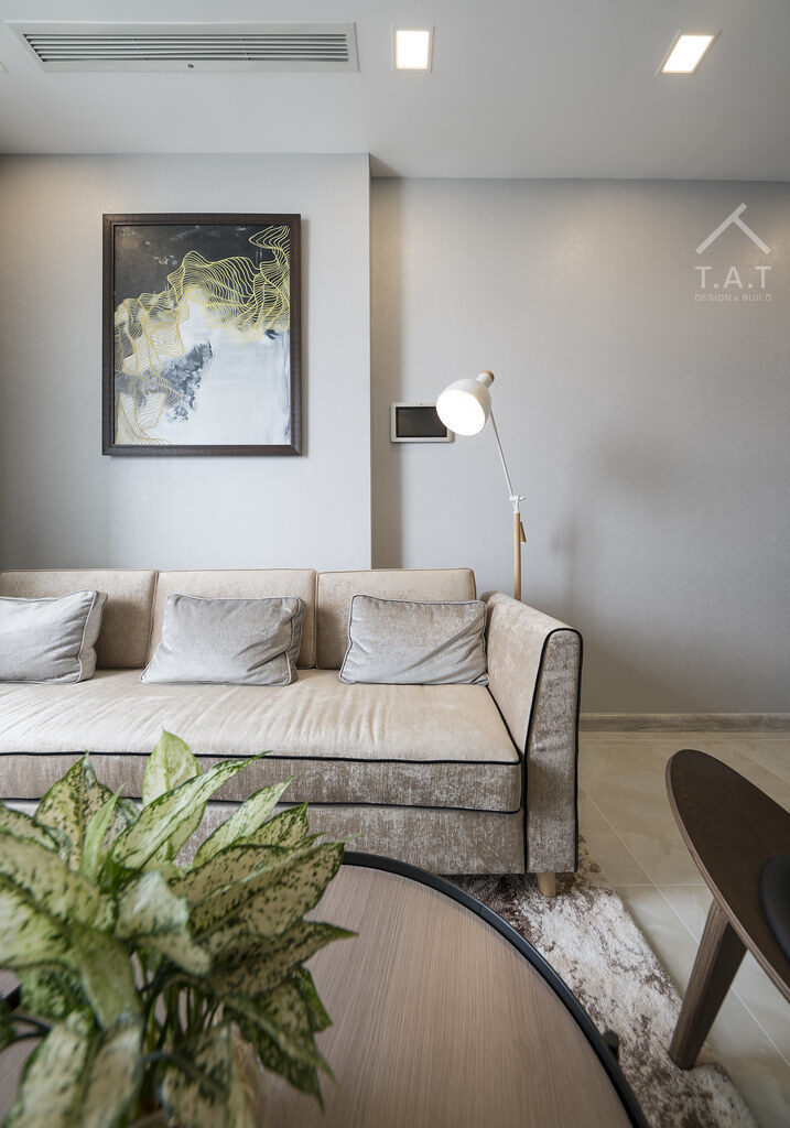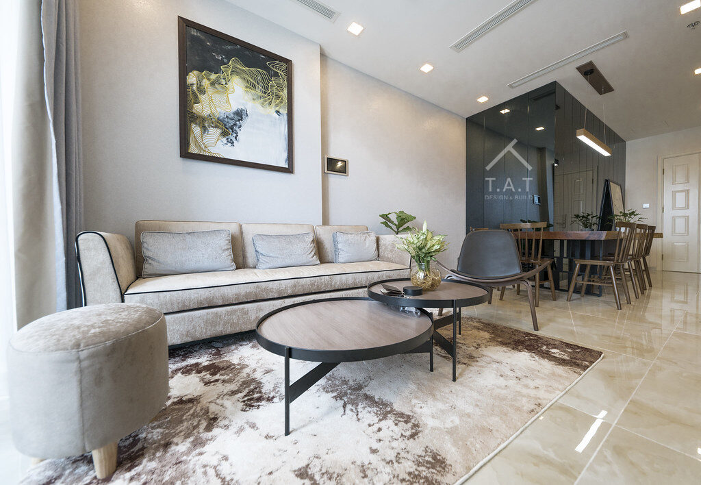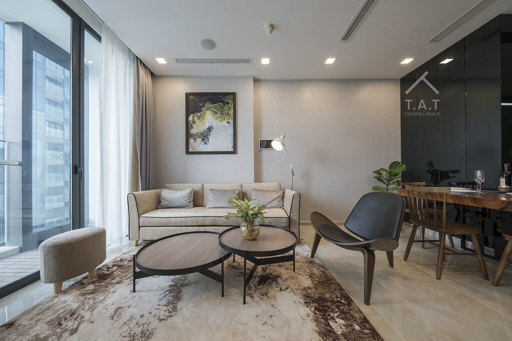 Căn hộ được thiết kế theo phong cách Modern Contemporary (hiện đại đương đại) có sự pha trộn tinh tế giữa các yếu tố Minimalism và một chút hơi thở Industrial sang trọng.