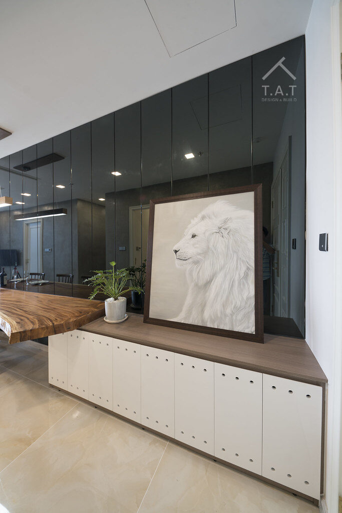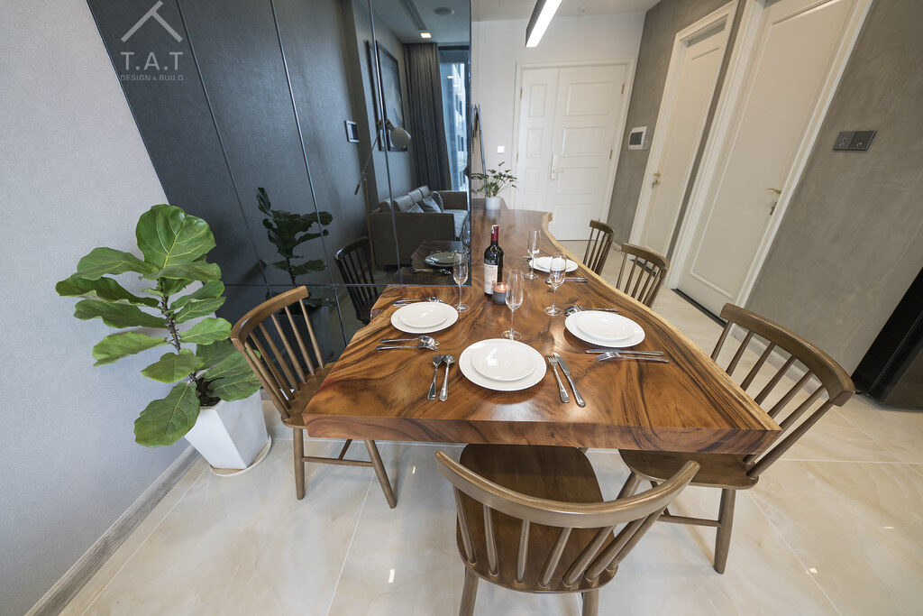 Căn hộ sử dụng lối thiết kế Open Plan, kết nối liền mạch giữa khu vực tiếp khách và bàn ăn. Điểm nhấn thông minh nhất chính là hệ vách kính thủy đen (black mirror) chạy dài dọc theo trục tường chính.