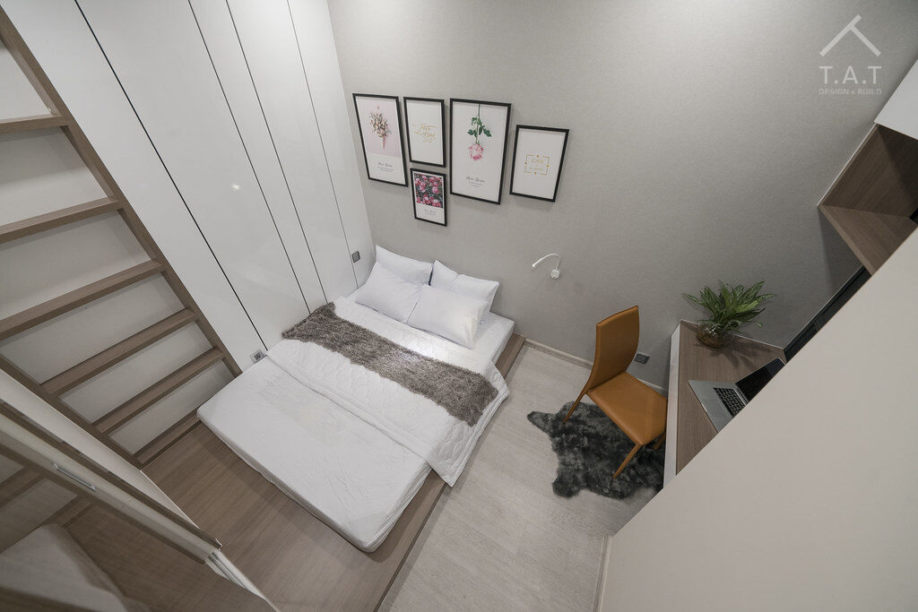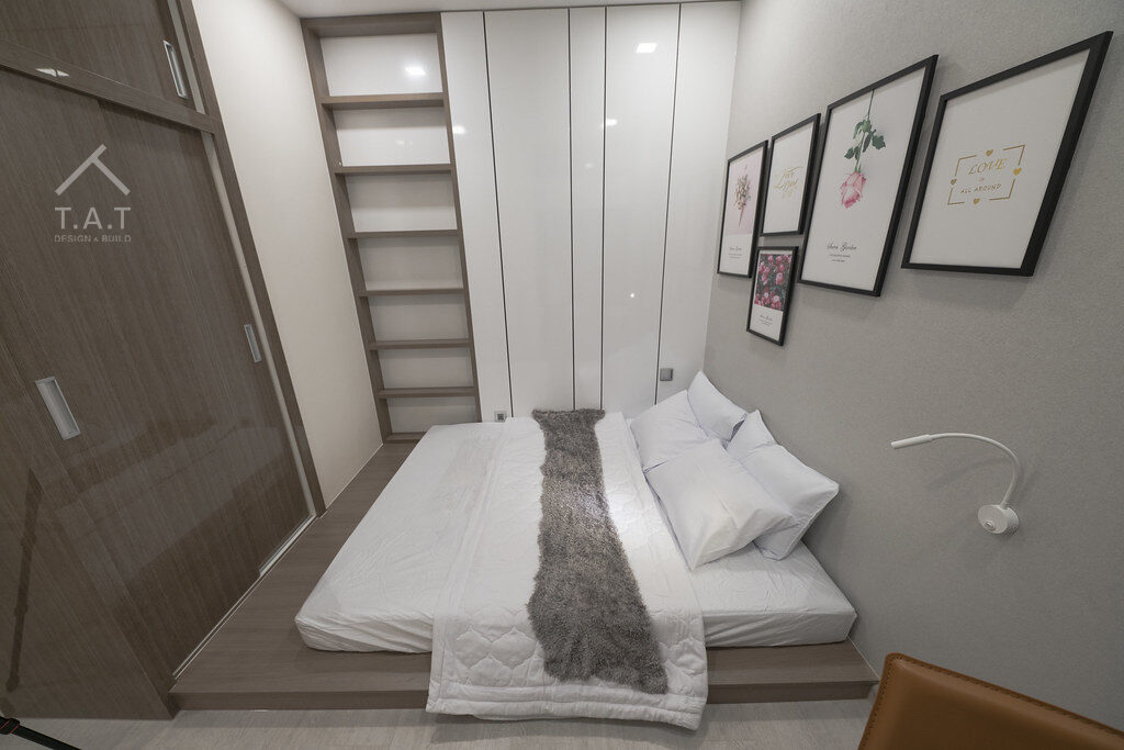 Điểm ấn tượng nhất là thiết kế giường bục (Platform bed) kịch tường, tích hợp cùng hệ sàn gỗ. Giải pháp này xóa bỏ ranh giới giữa giường và lối đi, giúp căn phòng trông rộng rãi hơn so với diện tích thực tế.