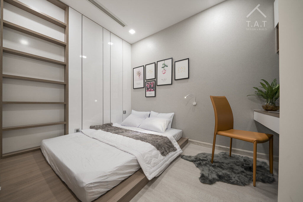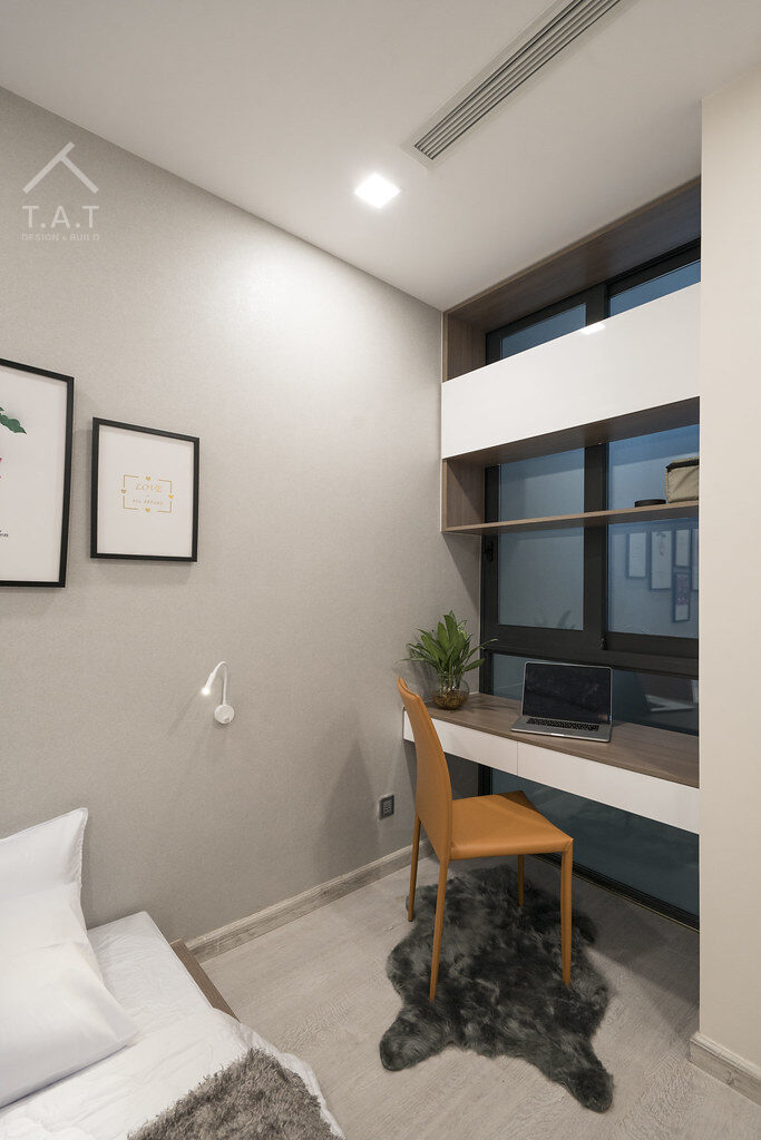 Phòng ngủ 2 mang một sắc thái trẻ trung, nhẹ nhàng và thanh lịch hơn, nhưng vẫn trung thành với tư duy tối ưu hóa diện tích thông minh của toàn bộ căn hộ. Đây là một ví dụ điển hình cho việc xử lý không gian hẹp mà vẫn đảm bảo đầy đủ công năng.