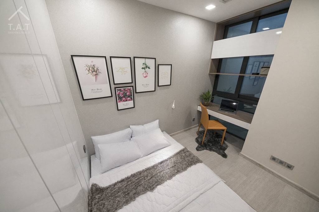 Căn phòng sử dụng bảng màu Neutral & Pastel (Trắng, Xám nhạt, Gỗ sồi) giúp khuyếch tán ánh sáng tốt nhất. Hệ thống đèn LED âm trần kết hợp với ánh sáng len lỏi từ các khe hắt tủ tạo ra một bầu không khí dịu mắt, rất phù hợp cho không gian nghỉ ngơi.