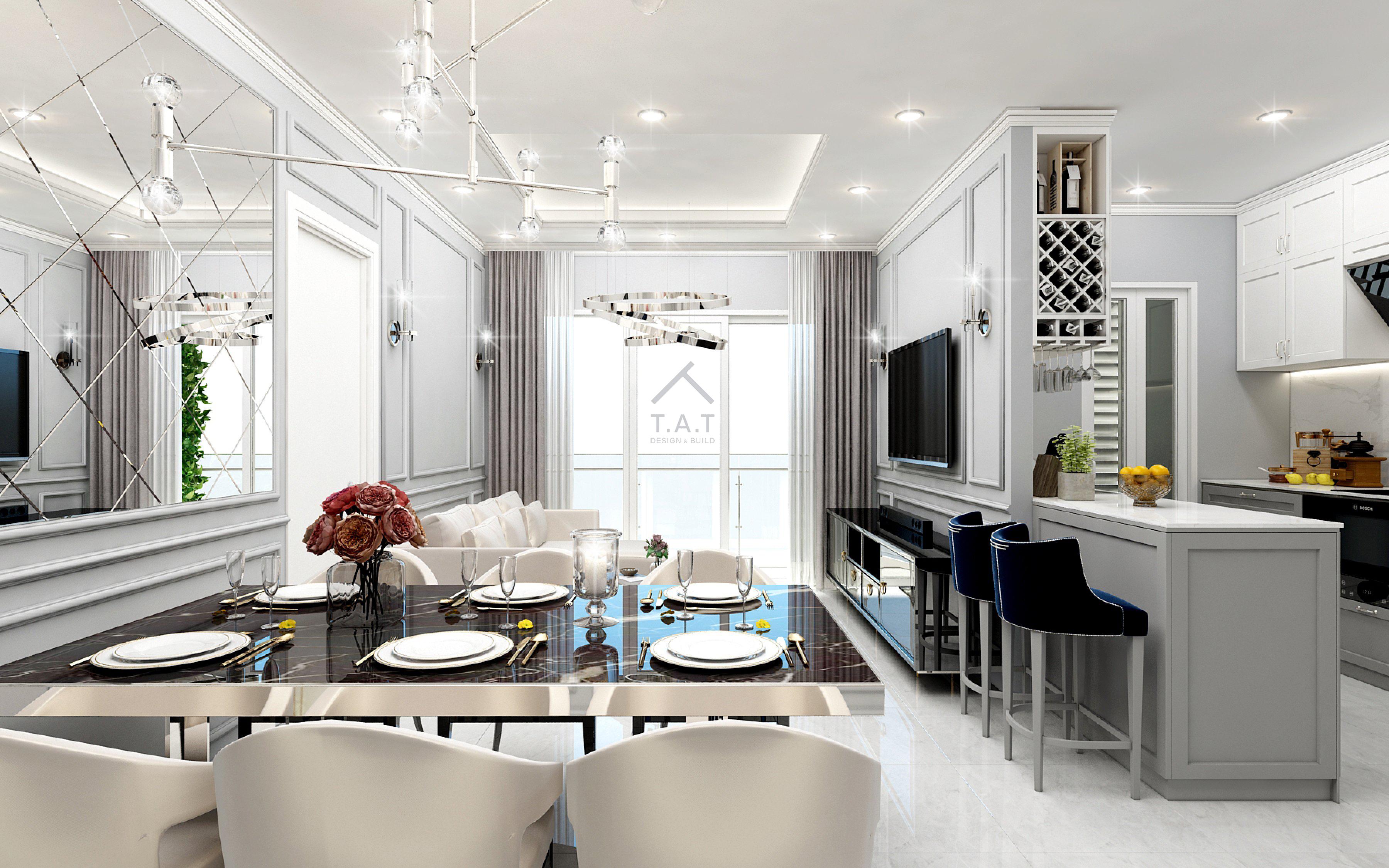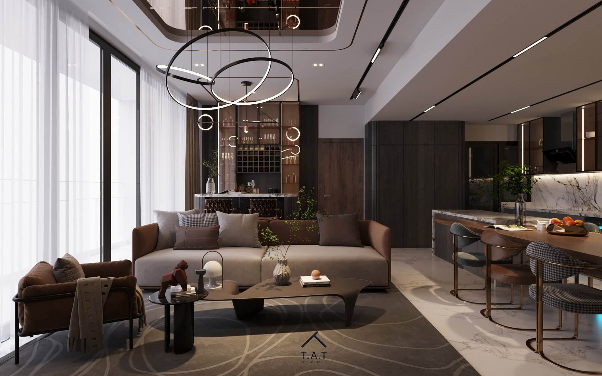 Không gian gây ấn tượng bởi phong cách sang trọng với sự kết hợp hài hòa giữa tông màu trầm ấm và ánh sáng tự nhiên từ khung cửa lớn. Thiết kế mở kết nối phòng khách và bếp tạo cảm giác rộng rãi, liền mạch và tối ưu hóa công năng sử dụng.