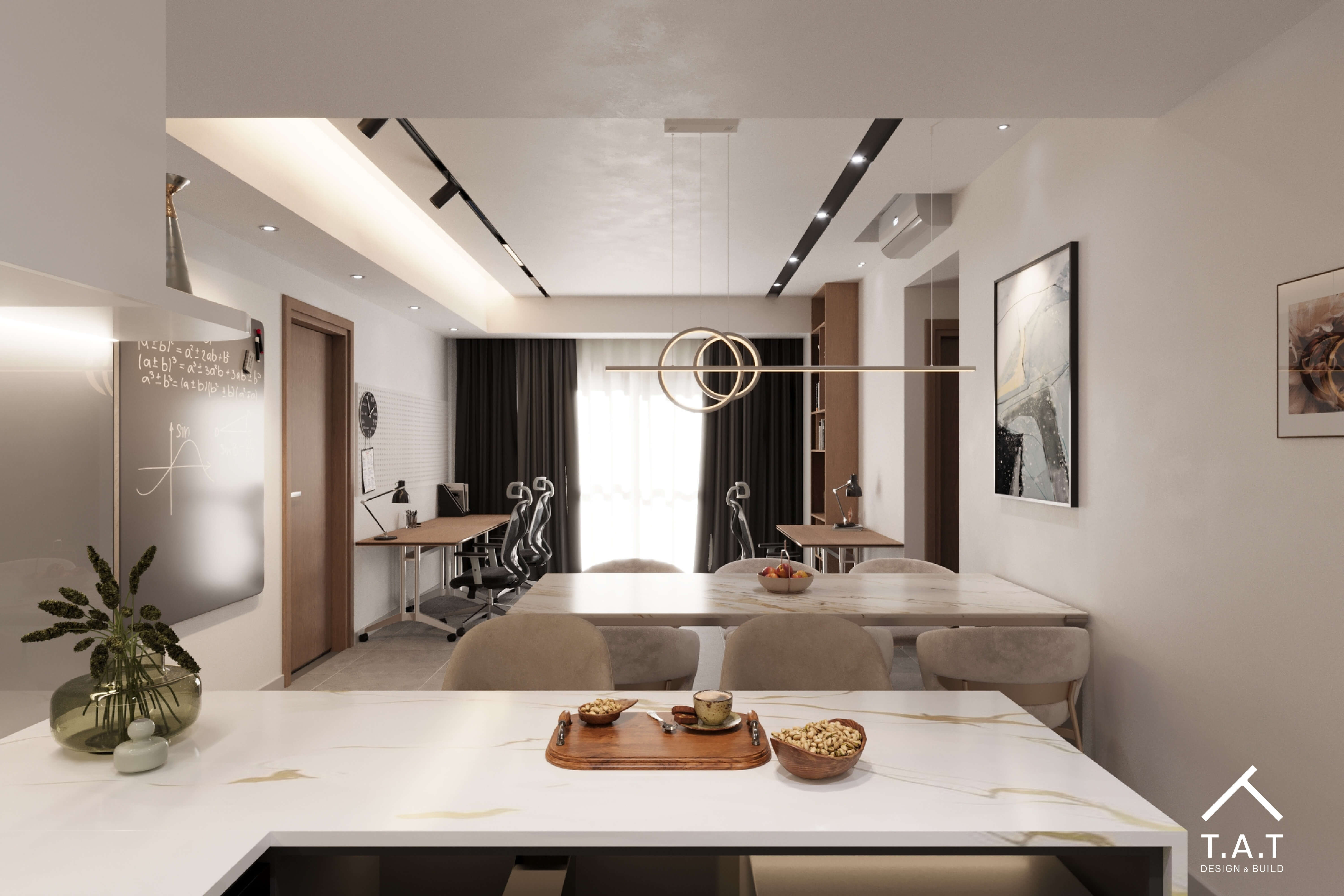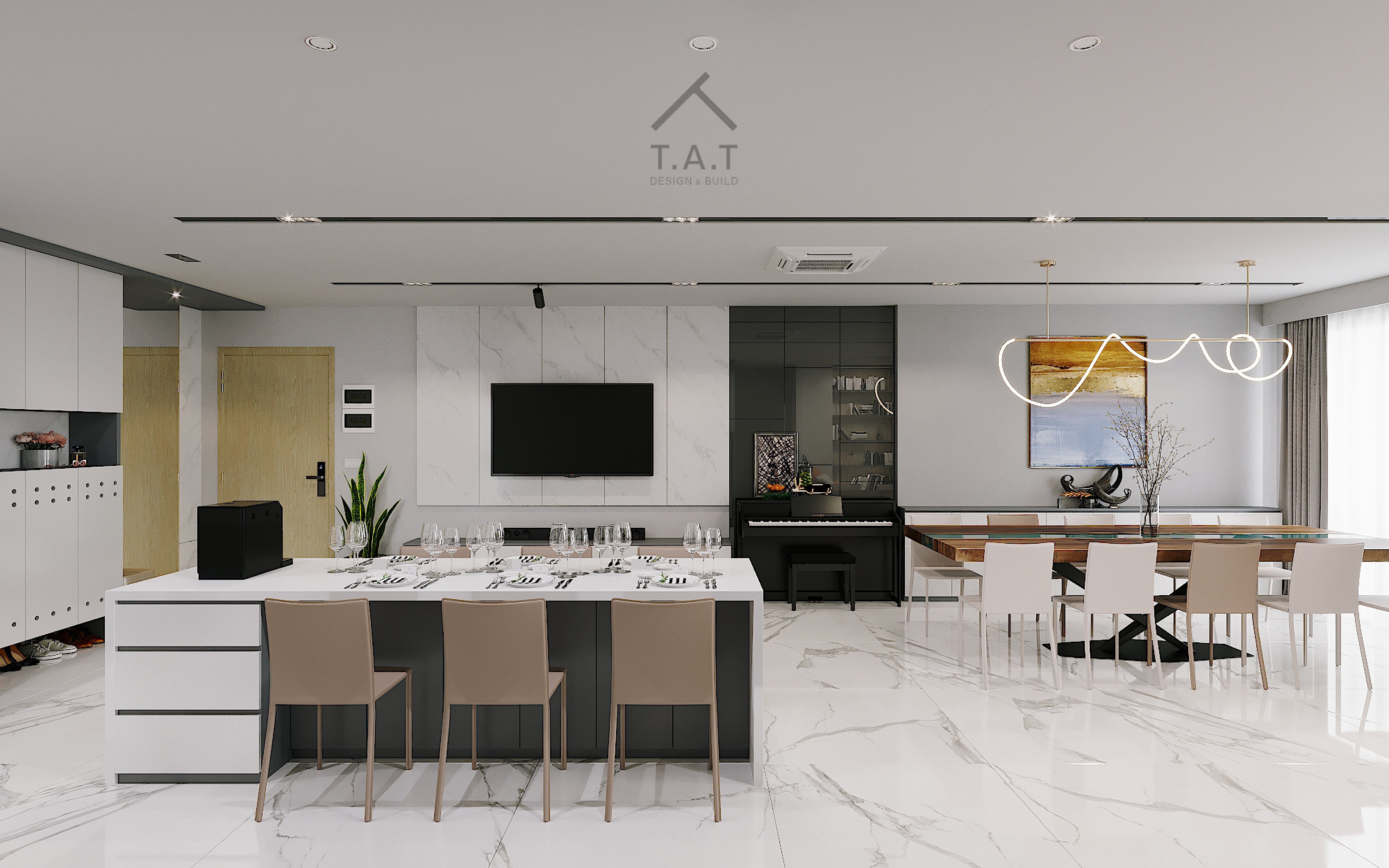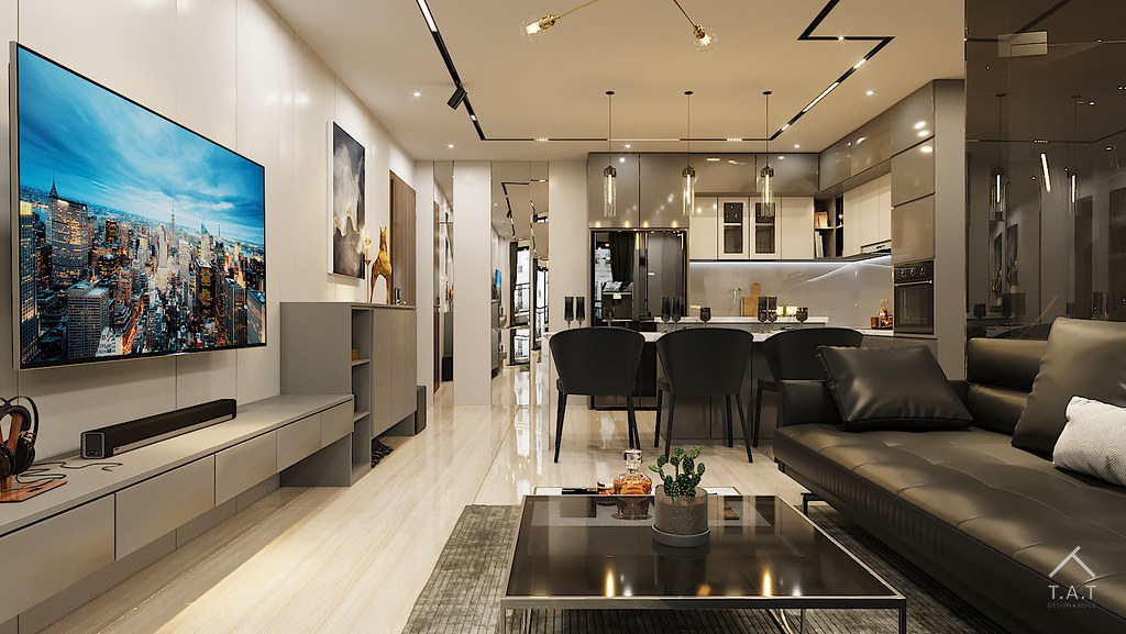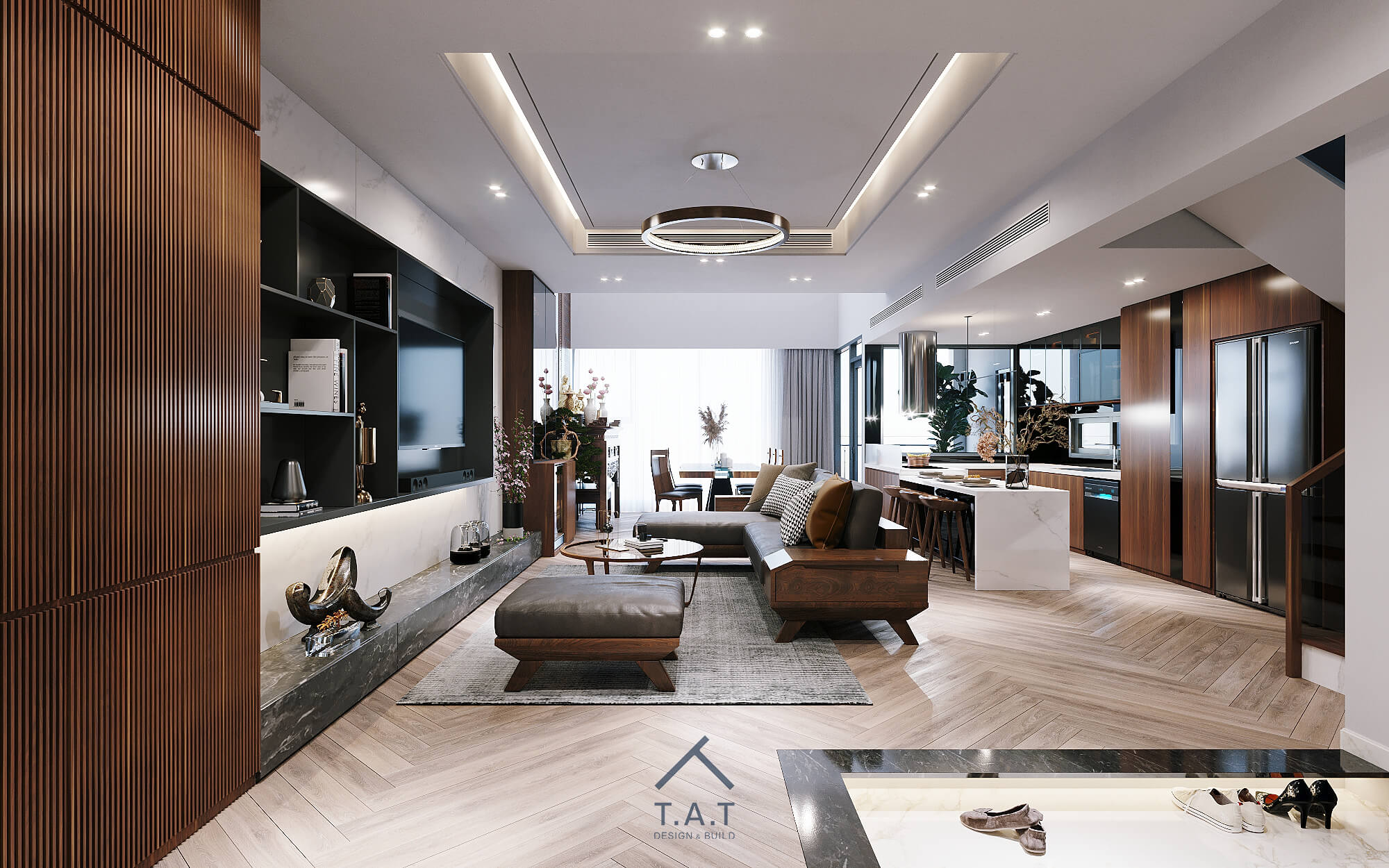 Vẻ sang trọng và ấm cúng nhờ sự kết hợp giữa các tông màu trung tính và hệ ánh sáng hắt dịu nhẹ. Bố cục không gian mở kết nối liền mạch từ khu vực ăn uống đến phòng khách, tạo cảm giác rộng rãi và thoáng đãng.