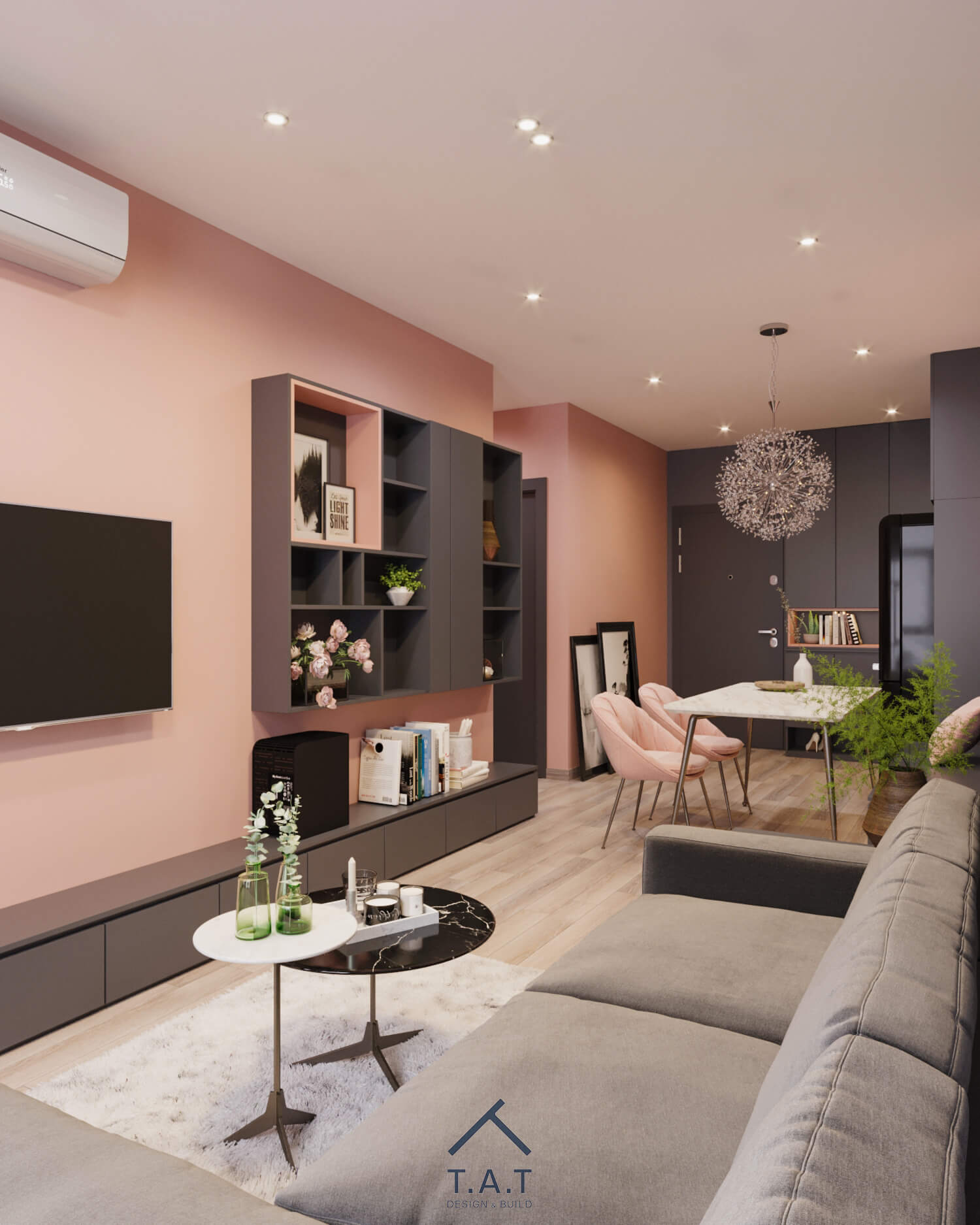 Không gian toát lên vẻ trẻ trung và ngọt ngào nhờ sự kết hợp giữa tường màu hồng pastel và nội thất xám trung tính hiện đại. Tổng thể căn phòng mang lại cảm giác ấm cúng, thư giãn và đầy cá tính cho người sử dụng.