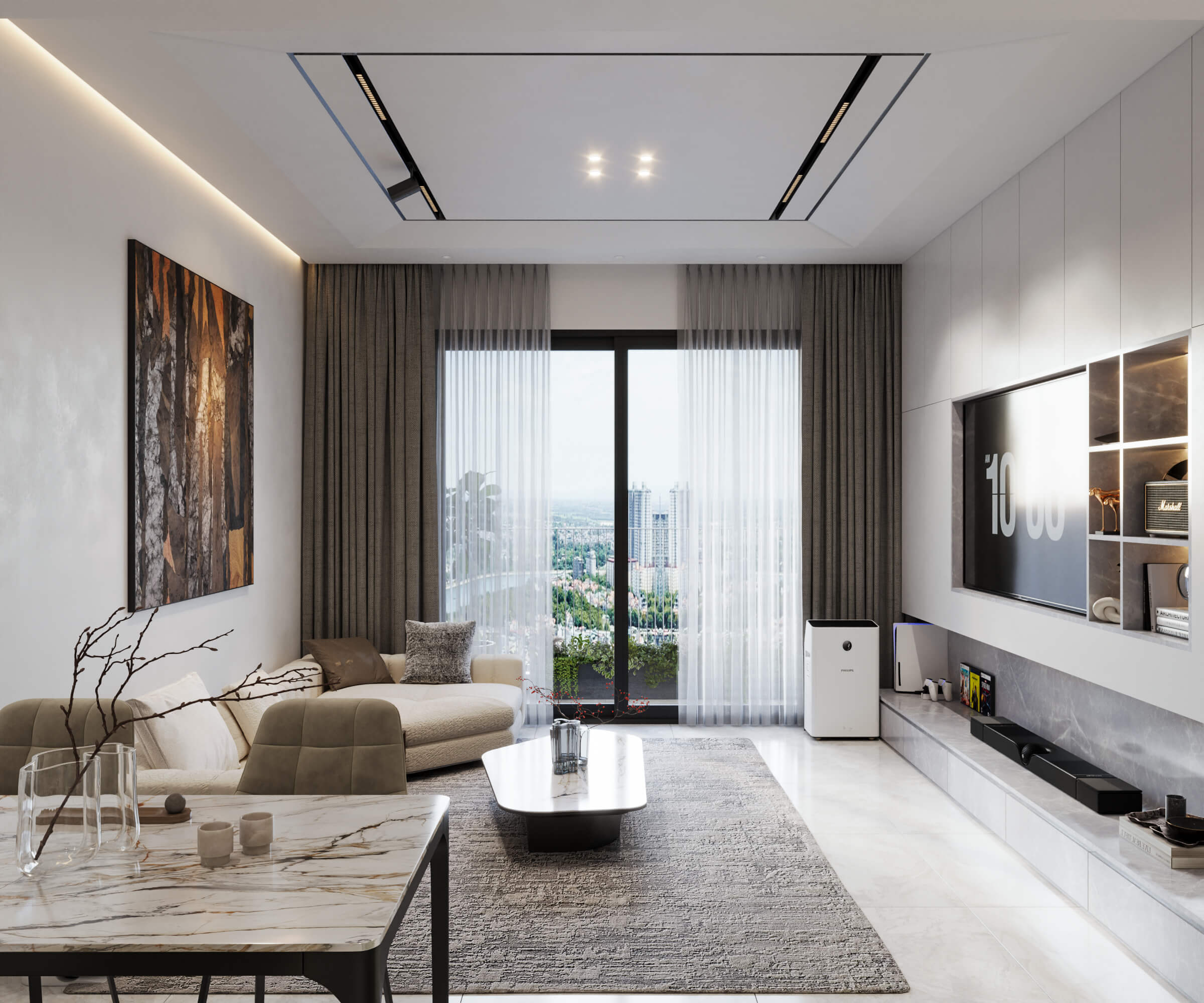Vẻ thanh lịch và tinh tế với sự kết hợp giữa các mảng tường phẳng tối giản và hệ tủ kệ kịch trần gọn gàng. Căn phòng sử dụng tông màu trung tính làm chủ đạo, được tạo điểm nhấn bởi bộ sofa tối màu sang trọng.