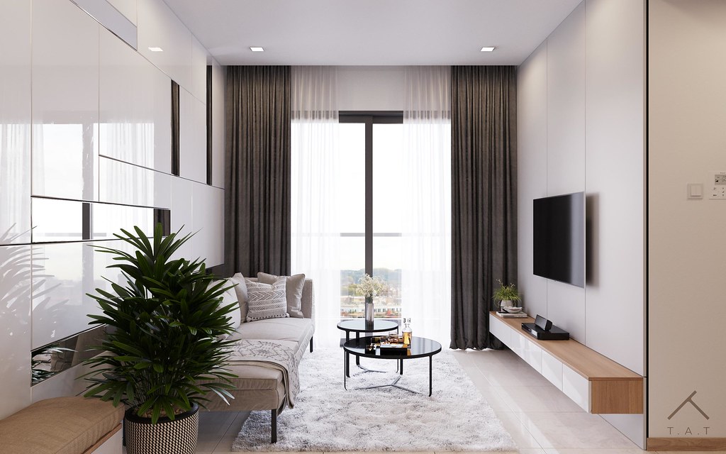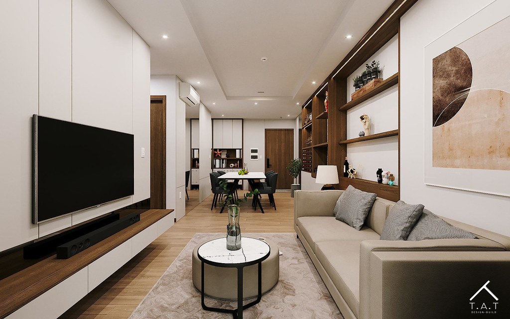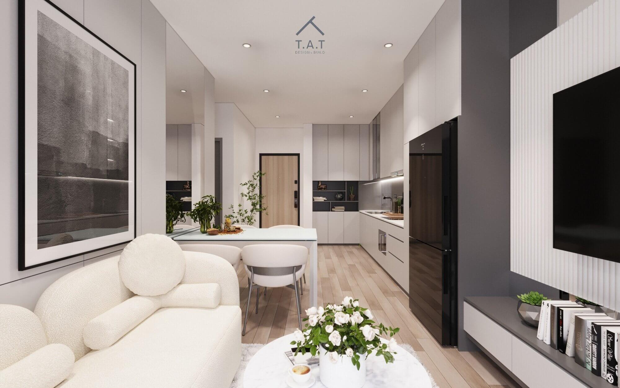 Không gian mang phong cách tối giản hiện đại với sự kết hợp hài hòa giữa các tông màu trung tính như trắng, xám và gỗ nhạt. Thiết kế thông minh kết nối liền mạch khu vực tiếp khách, ăn uống và bếp giúp tối ưu hóa diện tích cho căn hộ nhỏ.