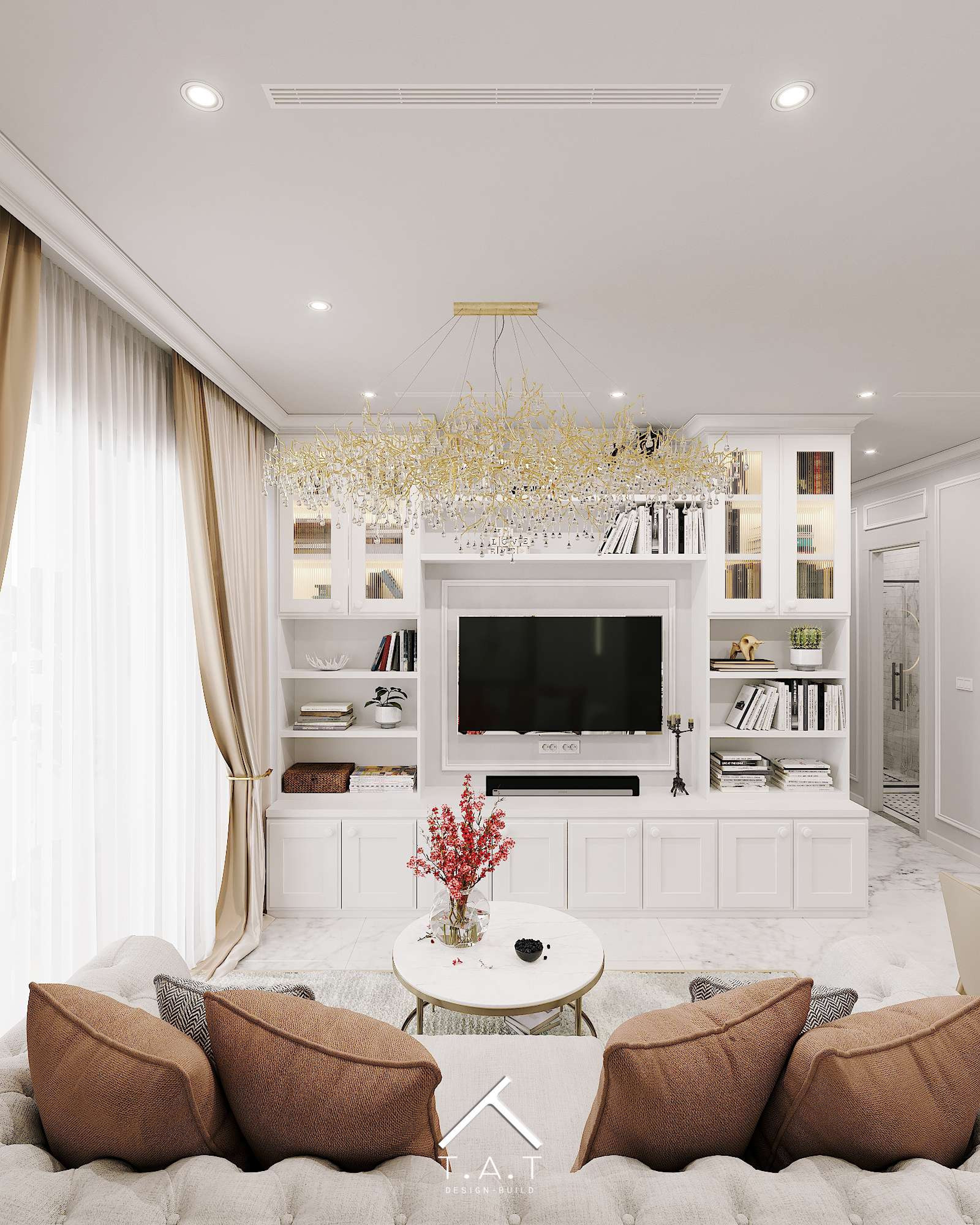 Căn hộ là một bản giao hưởng tinh tế giữa ngôn ngữ Modern Luxury và phong cách Tân cổ điển (Neo-Classic) thanh lịch. Toàn bộ không gian được bao phủ bởi bảng màu trung tính trang nhã như trắng kem và ghi sáng, làm nền cho sự lên ngôi của các vật liệu cao cấp.