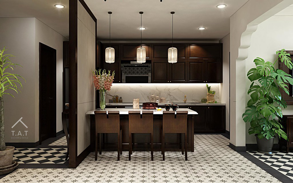 Vẻ sang trọng và ấm cúng nhờ sự kết hợp giữa các tông màu trung tính và hệ ánh sáng hắt dịu nhẹ. Bố cục không gian mở kết nối liền mạch từ khu vực ăn uống đến phòng khách, tạo cảm giác rộng rãi và thoáng đãng.