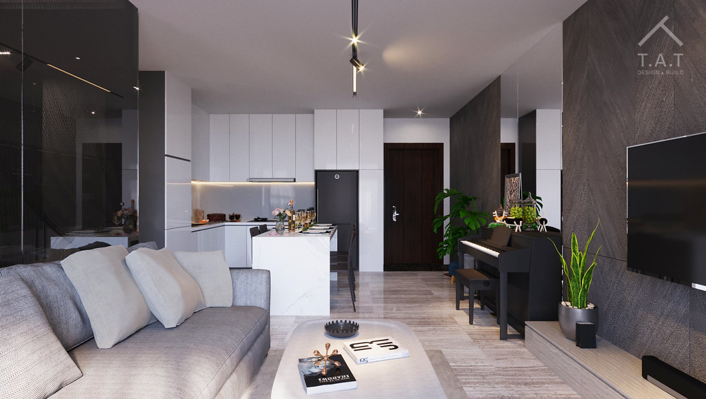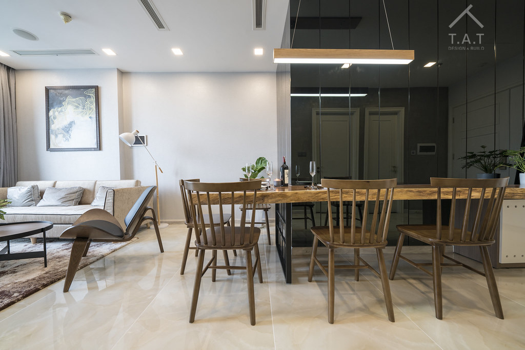 Căn hộ được thiết kế theo phong cách Modern Contemporary (hiện đại đương đại) có sự pha trộn tinh tế giữa các yếu tố Minimalism và một chút hơi thở Industrial sang trọng.