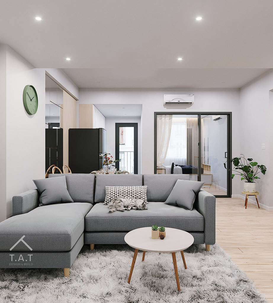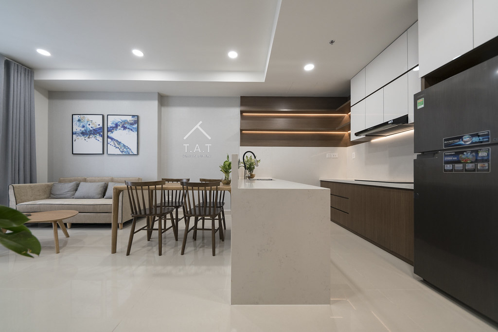 Không gian mang phong cách tối giản hiện đại với sự kết hợp hài hòa giữa các tông màu trung tính như trắng, xám và gỗ nhạt. Thiết kế thông minh kết nối liền mạch khu vực tiếp khách, ăn uống và bếp giúp tối ưu hóa diện tích cho căn hộ nhỏ.